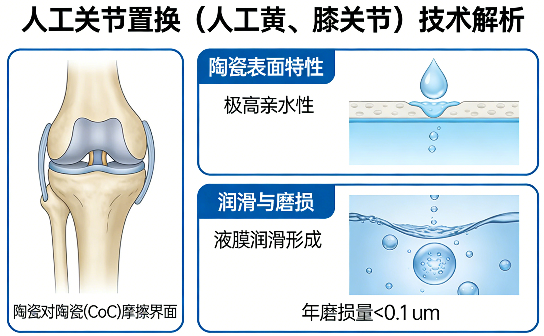 Trecie rozhranie keramika na keramiku (CoC) je v súčasnosti uznávané ako najlepšie riešenie. V dôsledku extrémne vysokej hydrofilnosti keramického povrchu sa medzi spojmi môže vytvoriť mazanie tekutým filmom a jeho ročný objem opotrebovania je zvyčajne menší ako 0,1 mikrónu , čím sa predlžuje životnosť dovážaných predmetov z 15 rokov na viac ako 30 rokov. 2. Presná zubná náhrada
